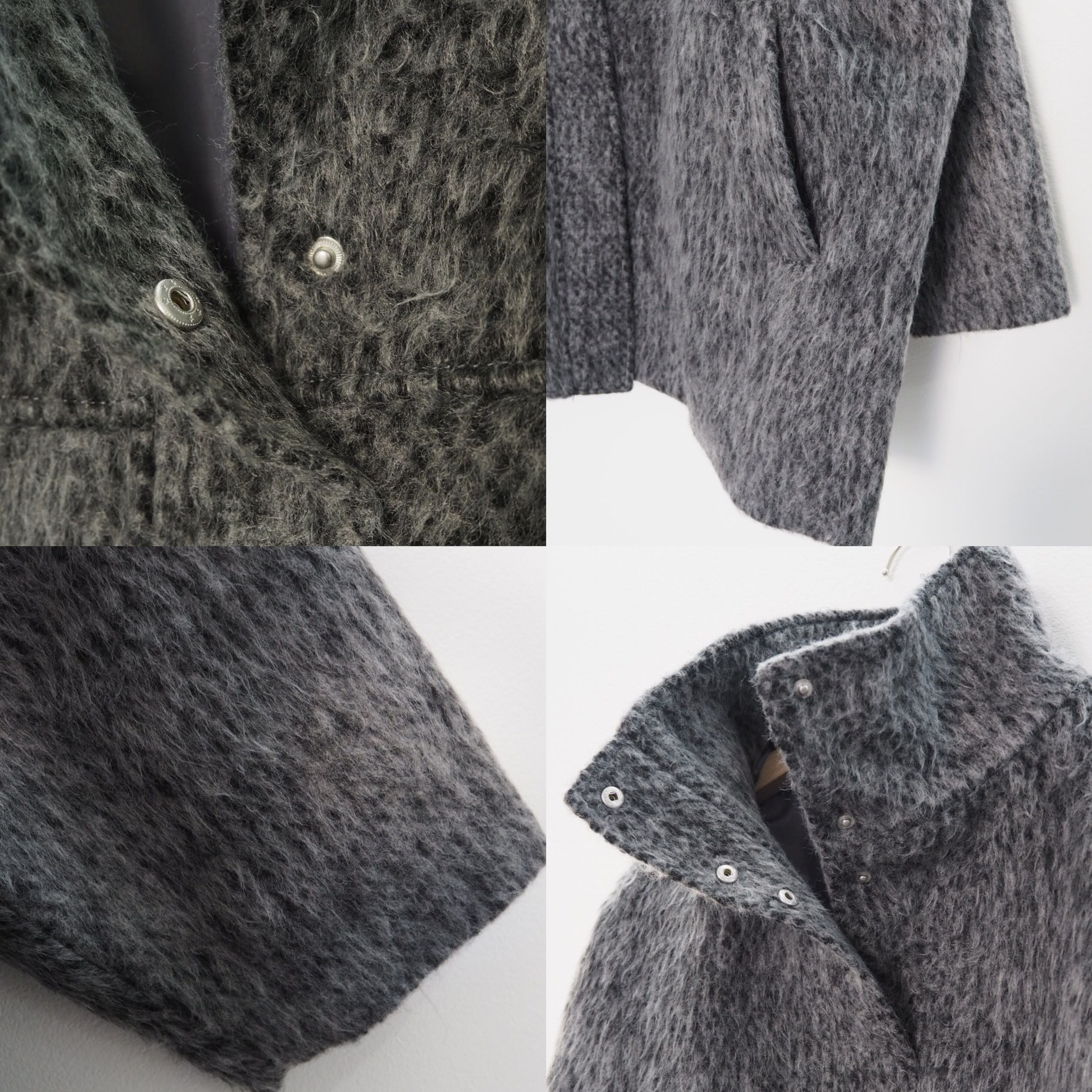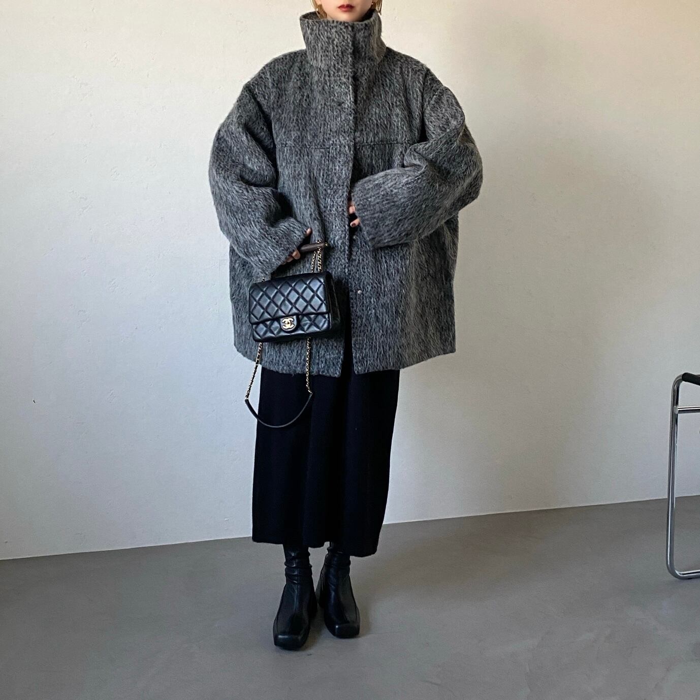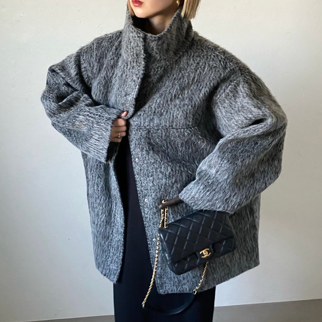 毛足の長いエアリーな素材感が上品なスタンドカラーミドルコート。ゆったりしたオーバーシルエットなので、中にニットを着込んでもごわつくことなく着ていただけます。スタンドカラーとして着用すればマニッシュでシックな印象に。防寒にもオススメです。スナップ釦仕様は、簡単に開閉がしやすく、表からは見えないのでスッキリとした印象で着用いただけます。パンツやスカートどちらにも合わせやすいミドル丈で、ヒップまで隠れる丈感が嬉しいポイント。