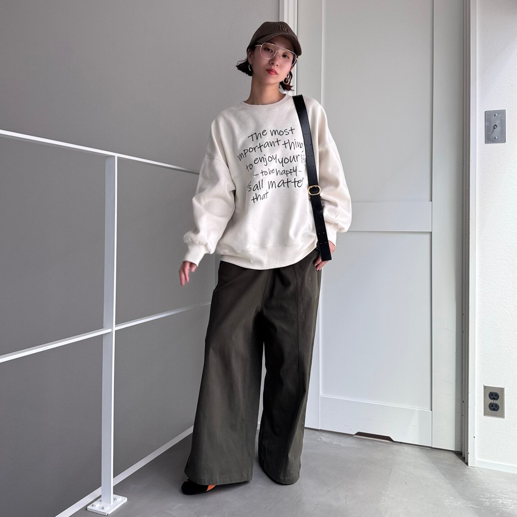 アシンメトリーにタックが施しており履いた時のシルエットが可愛いワイドパンツ。ボタンはデザインなのでそのまま着用頂けます。ウエストがゆったりサイズなので大きい方は腰で着用したりサスペンダーを使用すると◎フロントのタックによりコクーンのようなシルエットになり立体感のあるボトムです。